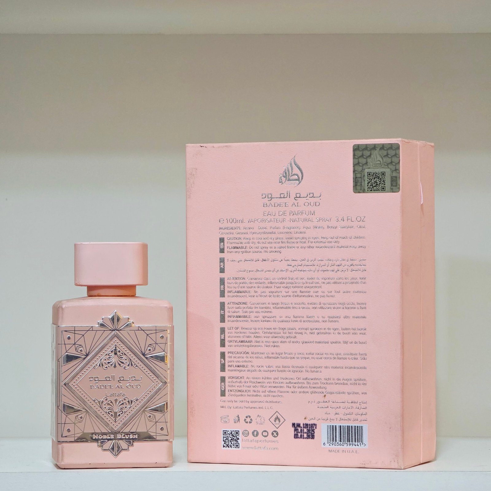 Noble Blush es la versión más dulce, luminosa y coqueta de la línea Badee Al Oud. Aunque Lattafa a veces lo presenta como unisex, en la práctica es un perfume claramente femenino, pensado para quienes aman los aromas alegres, cremosos y muy cumplidores.